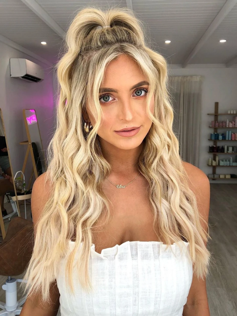 Pentru un look de festival elegant și ușor de realizat, coafura „half-up half-down” este perfectă. Această coafură îți permite să îți ții părul departe de față, dar să păstrezi totuși un look glamour. Dacă vrei să atragi toate privirile, adoptă un stil sirenă cu valuri lejere, care să coboare pe umeri.