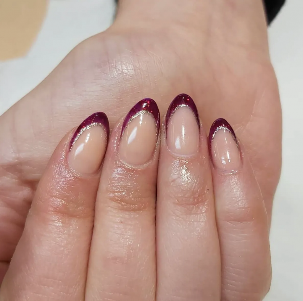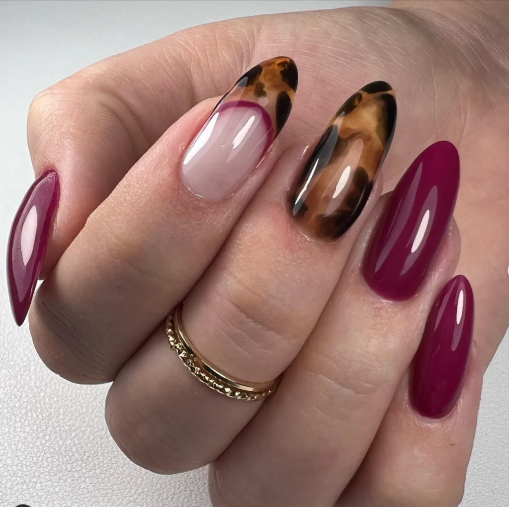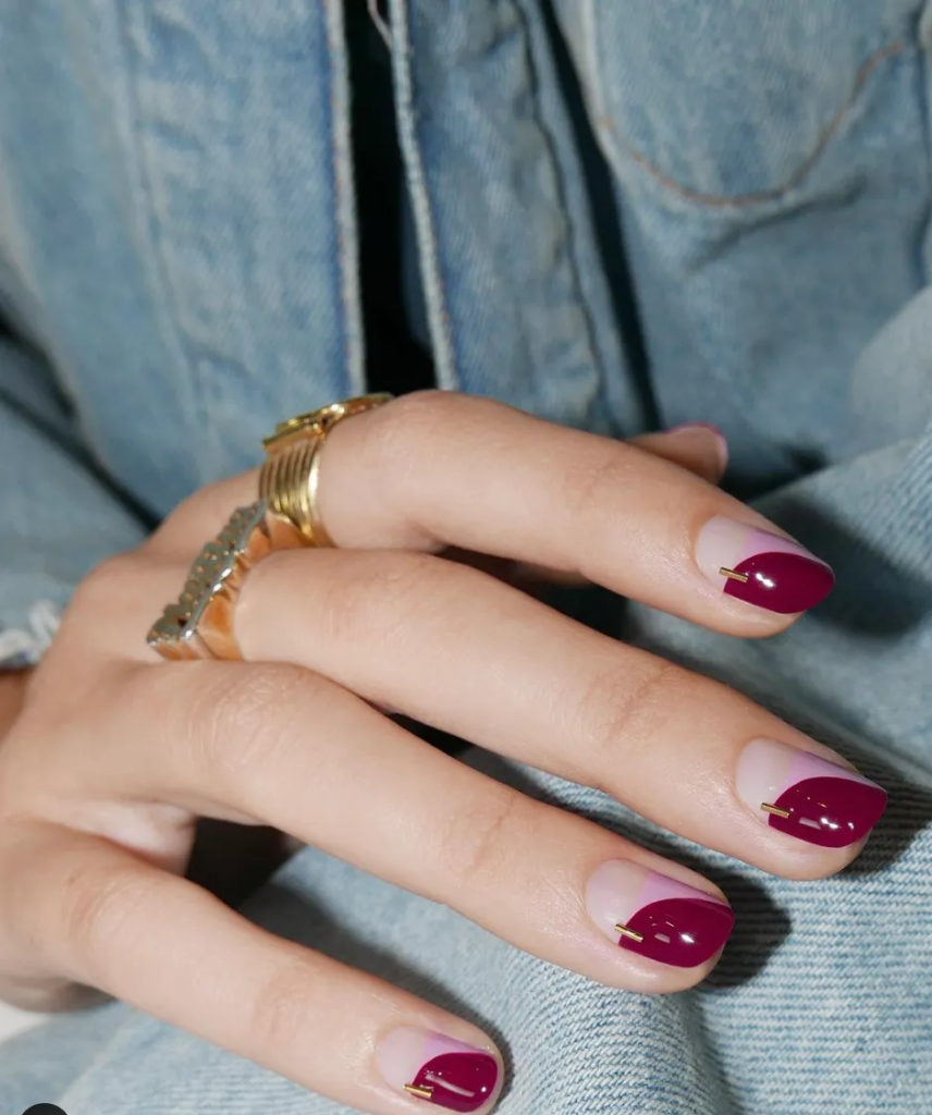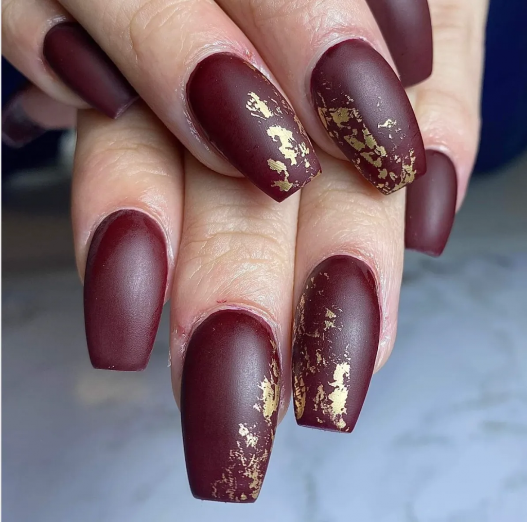 Pentru un efect elegant și festiv, burgundy-ul poate fi combinat perfect cu accente aurii. Această combinație creează un contrast deosebit și oferă manichiurii un aer sofisticat și prețios. O idee excelentă este să alegi o bază burgundy mată și să adaugi detalii subtile aurii, cum ar fi linii fine, puncte sau chiar un strat delicat de foiță de aur pe câteva unghii. Efectul final va fi unul rafinat, dar nu exagerat, perfect pentru zilele răcoroase de toamnă sau chiar pentru începutul sezonului festiv.