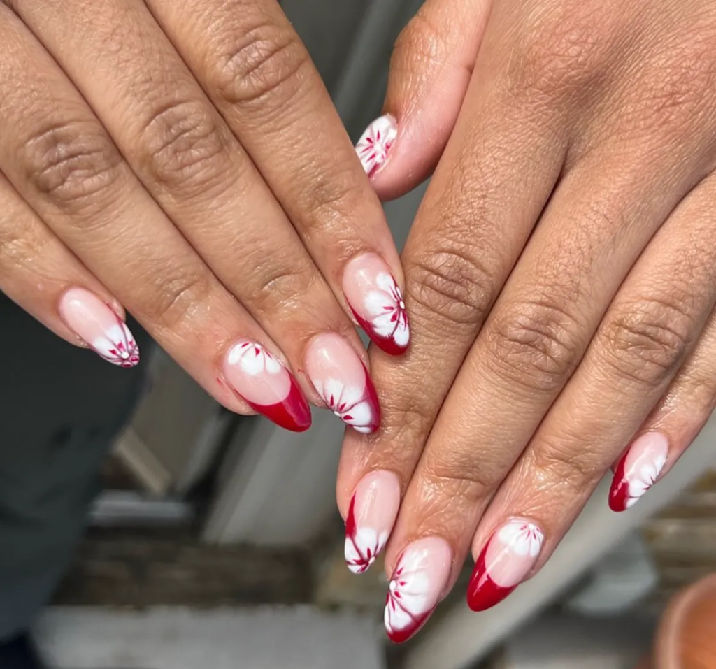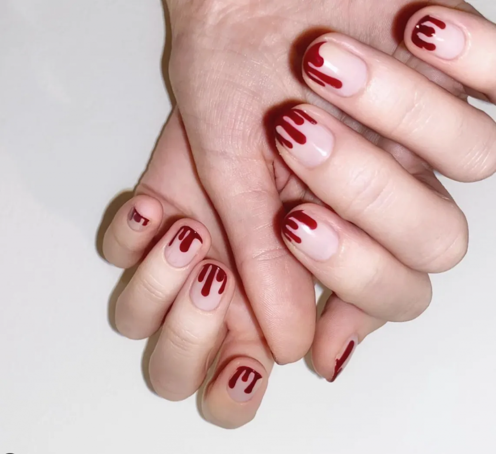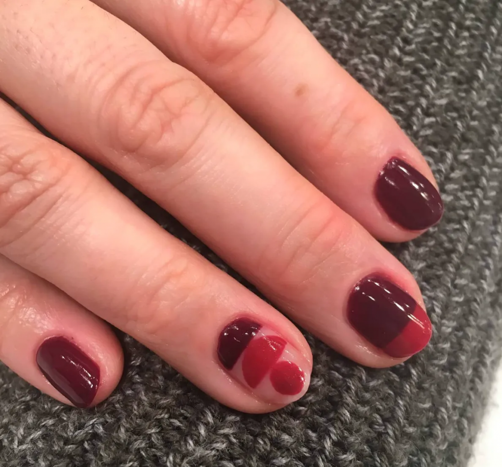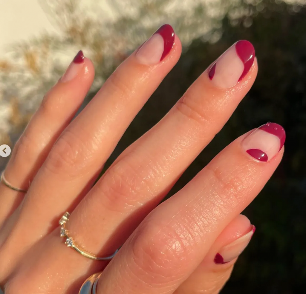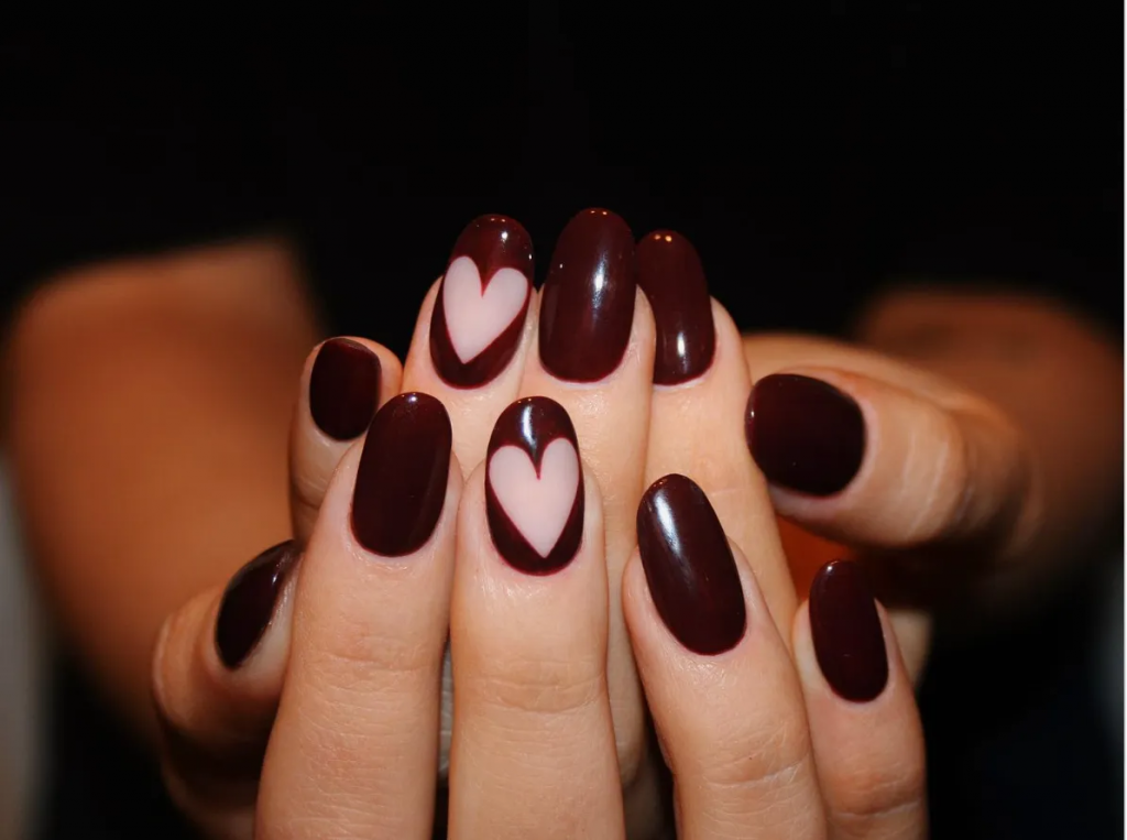 Designul cu spațiu gol rămâne un trend popular și în acest sezon, iar burgundy-ul se pretează excelent acestui tip de manichiură. Un exemplu interesant este crearea unor inimi, linii sau forme geometrice lăsate goale pe o bază burgundy, ceea ce adaugă un aer jucăuș și îndrăzneț întregii manichiuri. Spațiile lăsate libere creează un contrast subtil și adaugă o notă modernă și creativă.