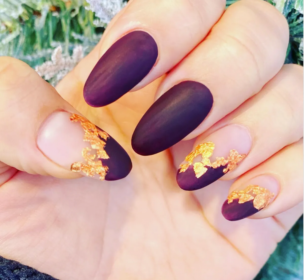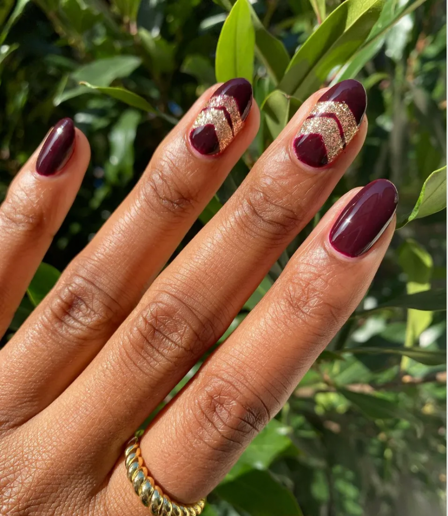 Dacă preferi o manichiură minimalistă, poți opta pentru accente aurii doar pe câteva unghii, lăsând restul într-un burgundy intens. Această variantă adaugă o notă de strălucire și eleganță fără să devină prea încărcată, păstrând totuși esența sezonului.