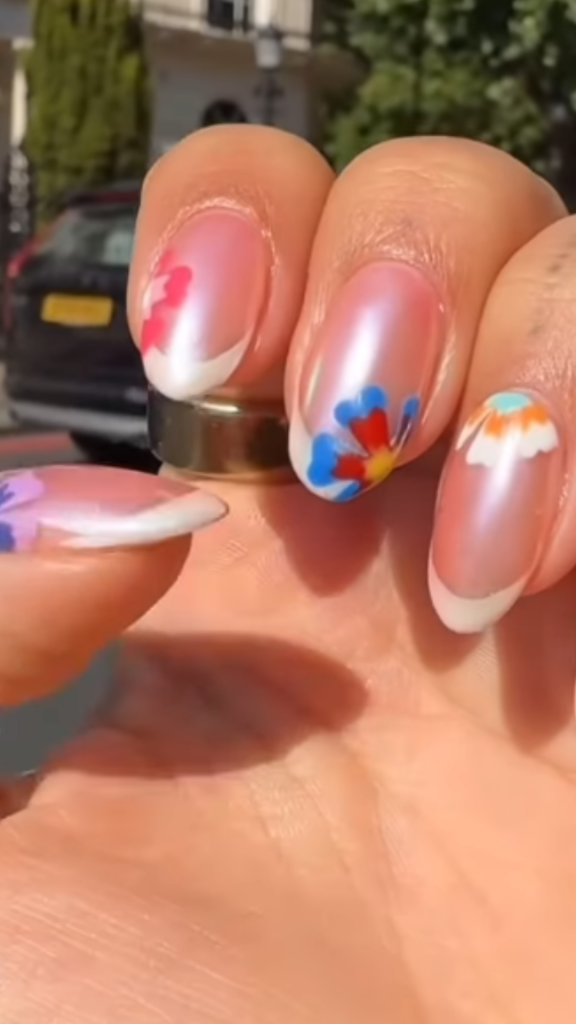 Unghiile lungi, în formă de migdală, cu o linie franceză curbată de culoare albă și o bază roz transparentă, au fost decorate cu flori de hibiscus multicolore, plasate strategic pe fiecare unghie. Finisajul strălucitor cromat a adăugat un plus de eleganță, transformând această manichiură într-un punct culminant al sezonului. Rita Ora a reușit să îmbine tradiția cu inovația, reinterpretând clasicul french tip într-o manieră fresh și modernă.