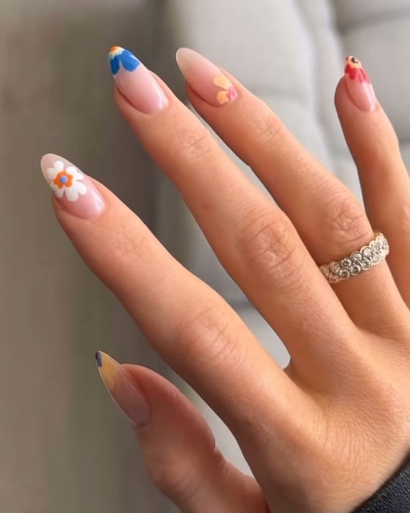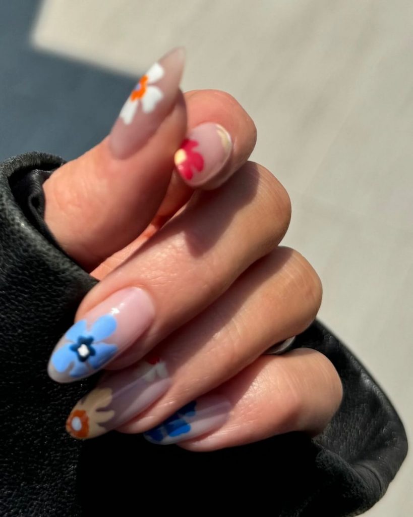 Unghiile lungi, în formă de migdală, au fost acoperite cu o bază naturală, pe care au fost plasate flori multicolore delicate, fără a include linia franceză clasică. Această abordare a fost o alternativă rafinată la manichiura Ritei Ora, demonstrând că stilul floral poate fi adaptat pentru a satisface gusturi variate, de la cele mai excentrice până la cele mai subtile.