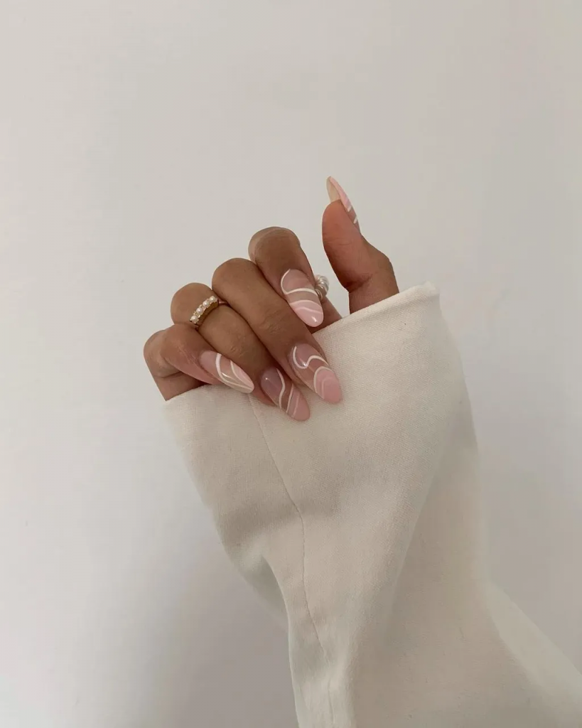 Dacă ești în căutarea unui look proaspăt și romantic, încearcă un design cu linii învârtite în nuanțe de roz și alb. Aceste nuanțe pastelate oferă un aspect delicat și feminin, fiind perfecte pentru o manichiură de zi sau pentru un eveniment special. Unghiile migdalate vor completa perfect acest design, adăugând eleganță și rafinament întregii ținute.