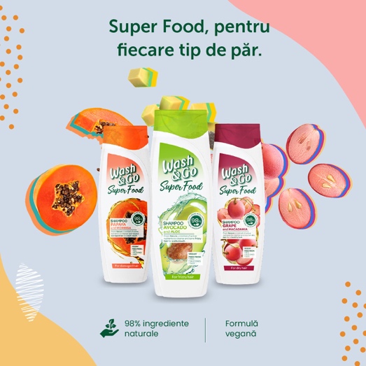 Inspirate din natură, produsele Wash&Go Super Food, oferă părului nutrienții de care are nevoie pentru o vitalitate și hidratare în profunzime. Datorită formulei cu 98% ingrediente naturale, fără silicon, sulfați și uleiuri minerale, Wash&Go se numără în categoria brandurilor care prioritizează sustenabilitatea și energia naturii, acordând atenție nevoilor diferitelor tipuri de păr.
