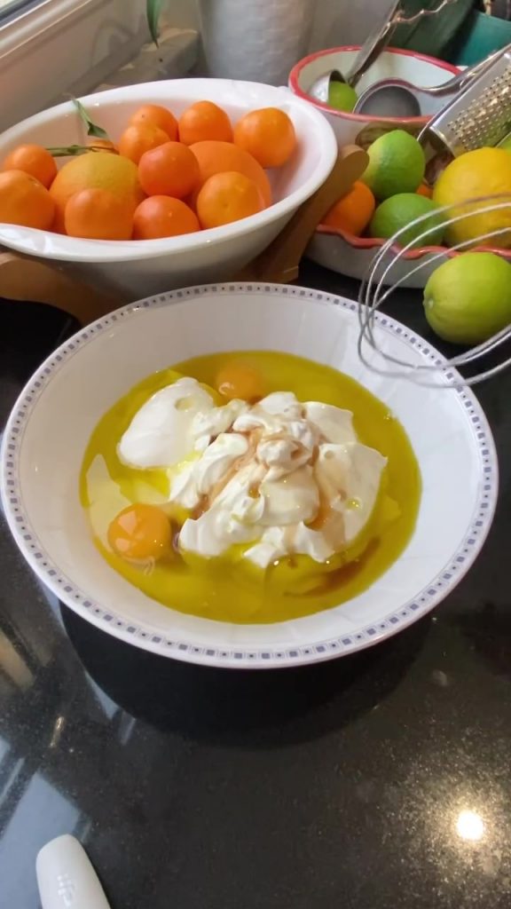 Se adaugă într-un bol iaurtul grecesc, ouăle, uleiul de măsline extra virgin și extractul de vanilie și amestecă bine până se obține o cremă omogenă.