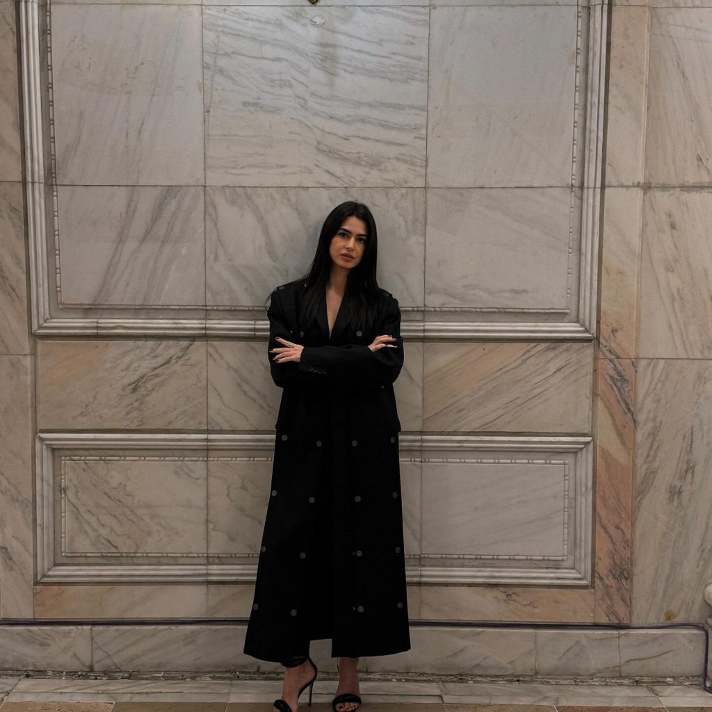 Bianca Niculae, cel mai bun tânăr designer, a purtat o ținută desprinsă din paginile istoriei. Bianca a optat pentru o rochie cu spatele gol și o fundă supradimensionată, accesorizată cu o pălărie neagră.