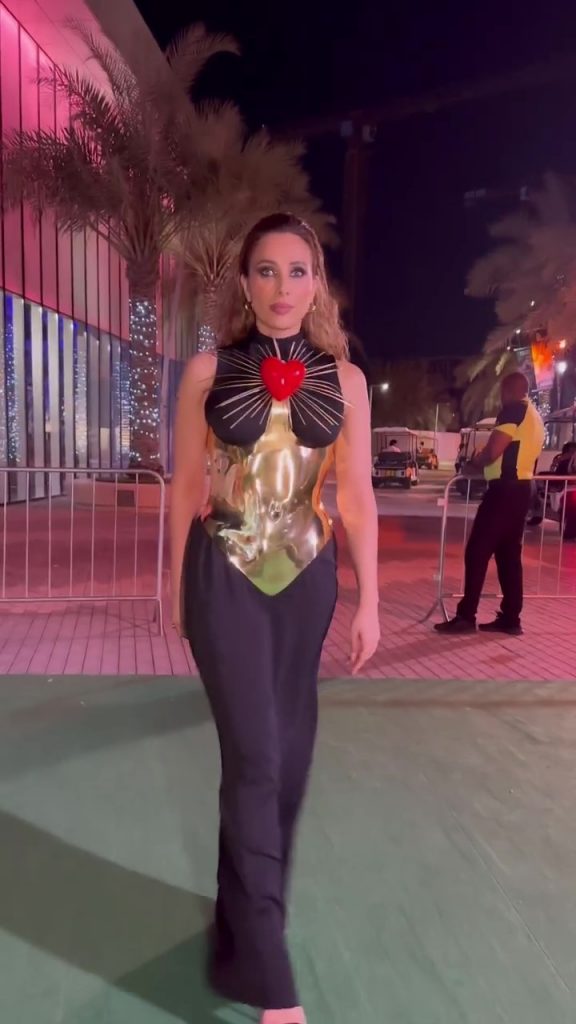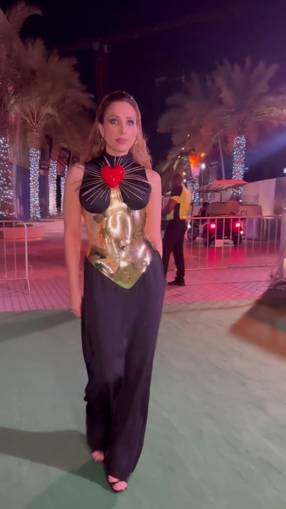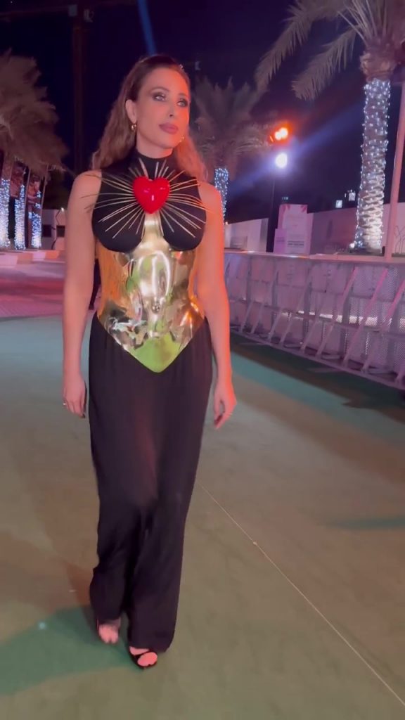 Într-o altă seară a aceluiași eveniment din Dubai, Iulia a purtat o rochie neagră, lungă și fluidă, peste care a pus un corset auriu cu o inimă cu țepi în centrul bustului. Spre deosebire de outfitul precedent, de această dată, artista a avut o cu totul altă prezență, mult mai sexy și încrezătoare în sine.