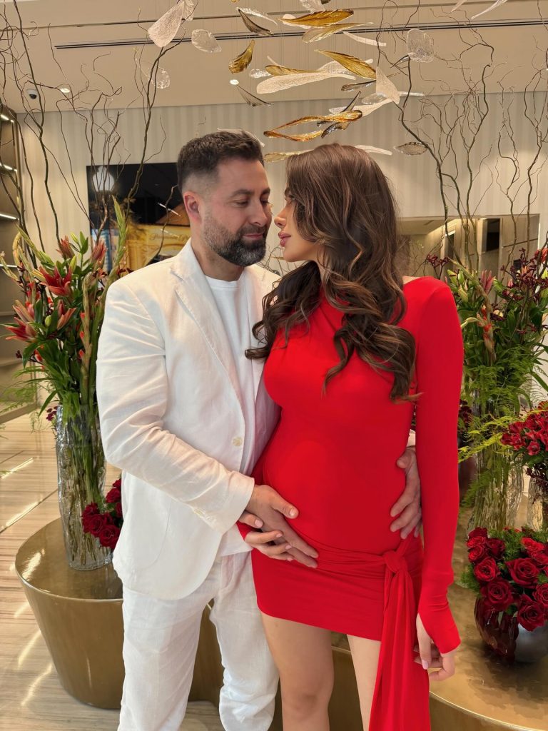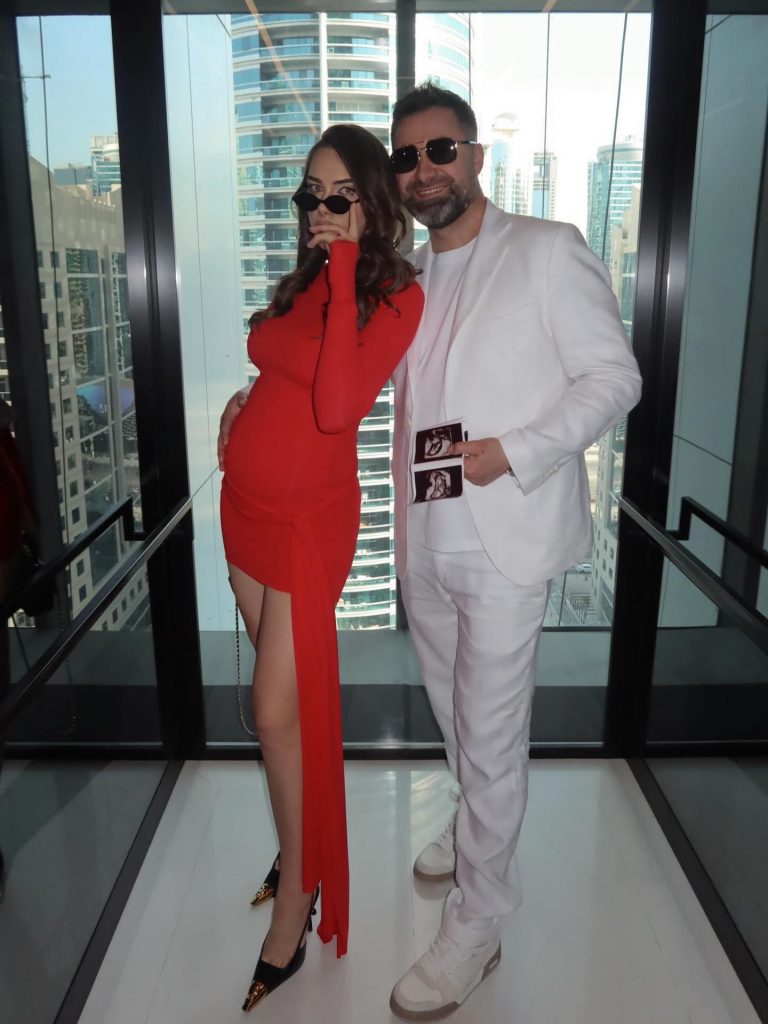 Îmbrăcată într-o rochie roșie care îi lasă la vedere burtica de gravidă în câteva luni, Iustina a pozat alături de soțul ei și de ecografia bebelușului care este pe drum.
