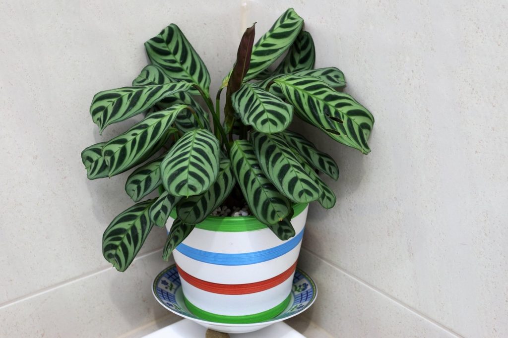 Calathea sau planta care se roagă este apreciată pentru varietățile ei cu frunze mari, ovale, colorate în mov, roz sau roșu. Este o plantă care suportă spațiile puțin luminate și va iubi umiditatea din baie.