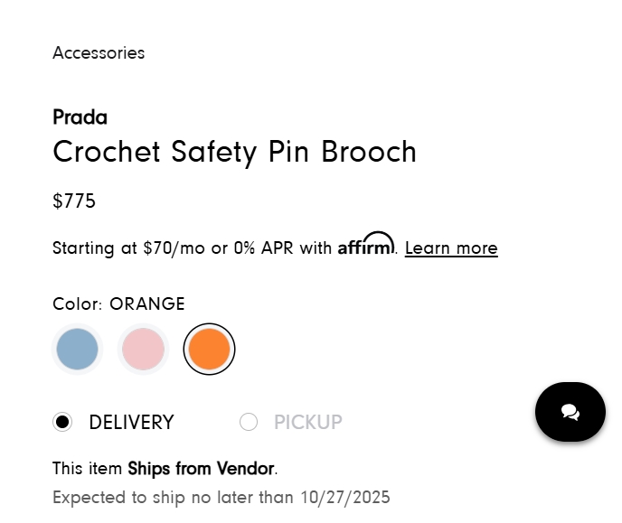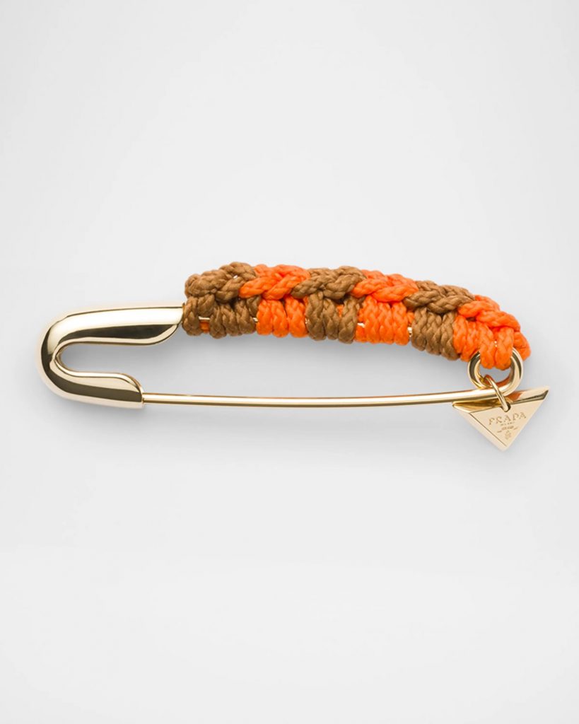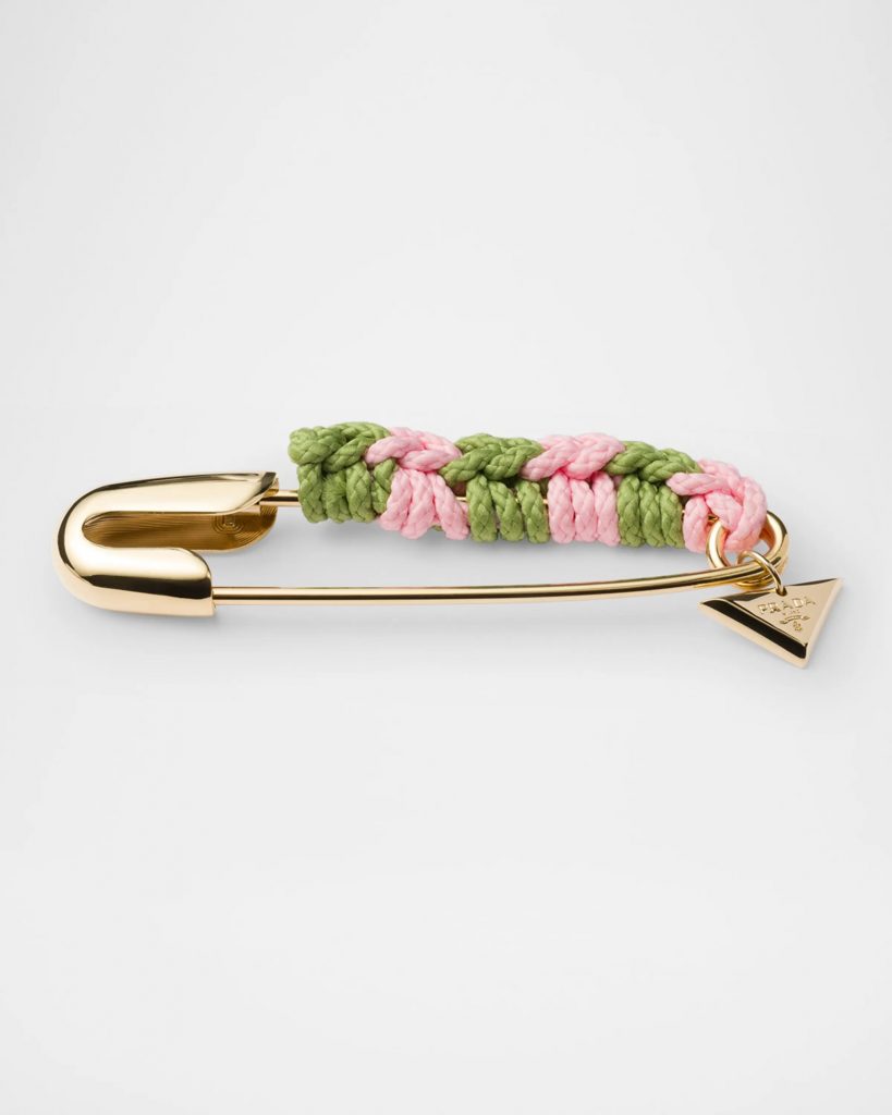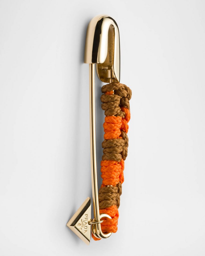 Prada vinde o broșă în formă de ac de siguranță cu un preț exorbitant. Accesoriul din alamă și bumbac vine în trei combinații diferite de culori. Toate cele trei modele au la bază acul de siguranță din alamă, diferența fiind detaliul croșetat. Casa de modă a asociat culorile albastru și maro, roz și verde și portocaliu și maro pentru cele trei broșe.