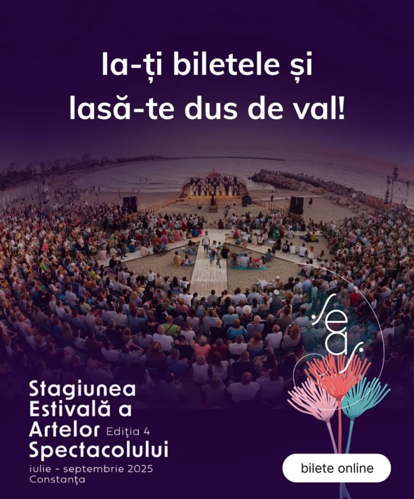 Acces și bileteOnline: MyStage.ro și Bilet.roFizic: Agenția Teatrului de Stat Constanța (bd. Tomis 97), Info Desk City Park Mall, precum și casierii mobile în toate locațiile de spectacol.Beneficii: Restaurantele și cafenelele partenere oferă reduceri spectatorilor SEAS pe baza biletului din ziua respectivă.SEAS 2025 reconfirmă Constanța ca oraș al artei vii, un centru estival al teatrului și al muzicii, care investește în cultură, comunitate și relevanță europeană.