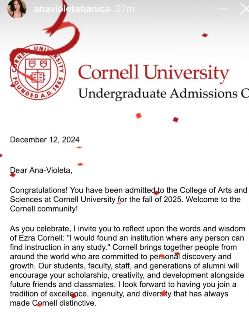 Ana Violeta Bănică a fost admisă la Colegiul de Arte și Științe al Universității Cornell. Incredibil de mândră de această realizare, Andreea Marin a publicat scrisoarea de admitere a fiicei sale pe Instagram, alături de un mesaj înduioșător.